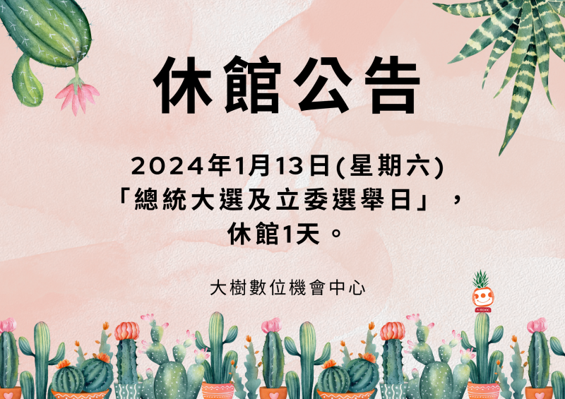 最新消息 DOC快訊 ::: <上一則 返回列表 下一則> 大樹DOC 1/13休館 發布日期:2024-01-12 人氣:190 休館公告 2024年1月13日(星期六) 「總統大選及立委選舉日」,休館1天。 大樹數位機會中心 <上一則 返回列表 下一則>
