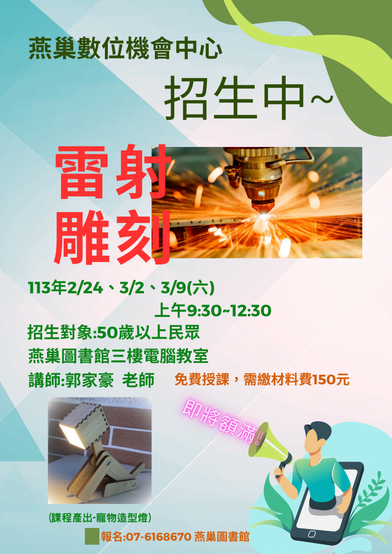 廣受大家喜愛的雷雕課程即將開課,歡迎有興趣的朋友相揪來上課喔!