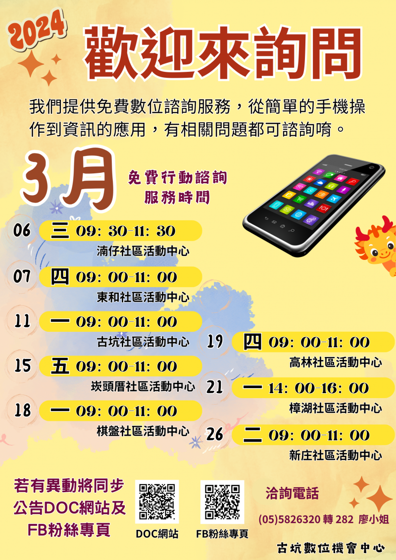 我們提供免費行動數位諮詢服務,從簡單的手機操作到資訊的應用,有相關問題都可來諮詢唷!