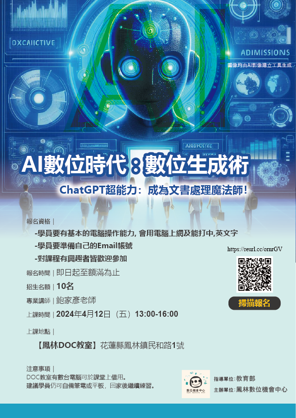 透過本課程可以瞭解到AI生活應用範例、常見AI生成軟體介紹,與課程實作練習。