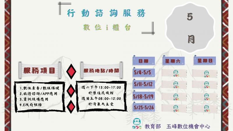 最新消息 DOC快訊 ::: <上一則 返回列表 下一則> 113年5月份行動諮詢服務時間及地點公告 發布日期:2024-05-02 人氣:87 鼓勵各位民眾前往公告地點到我們的「數位 i 櫃台」,多加利用數位諮詢服務來為大家解決一些瑣碎的小事,除了服務外還可以藉此機會更了解五峰鄉清泉部落的在地人文特色、泰雅風情等景點。 五峰 DOC 歡迎大家!! <上一則 返回列表 下一則>