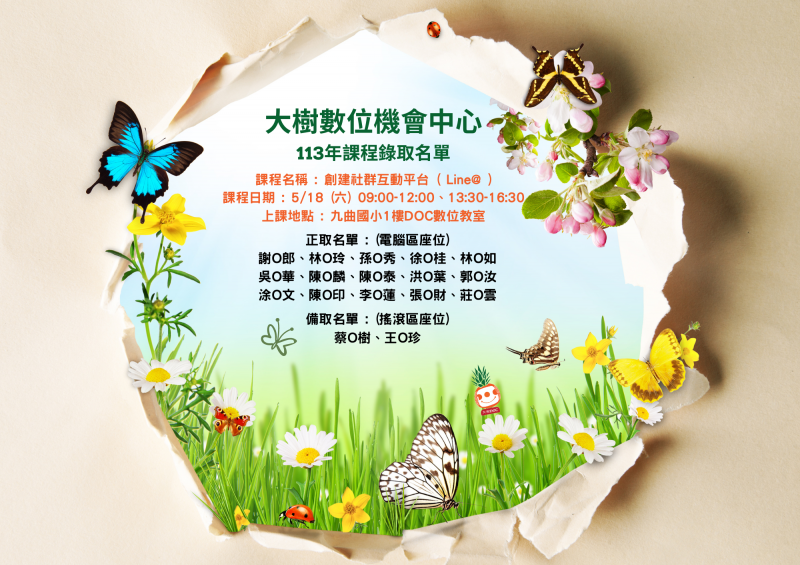大樹數位機會中心 113年課程錄取名單課程名稱 : 創建社群互動平台 ( Line@ ) 課程日期 : 5/18 (六) 09:00-12:00、13:30-16:30 上課地點 : 九曲國小1樓DOC數位教室正取名單 : (電腦區座位) 謝O郎、林O玲、孫O秀、徐O桂 林O如 吳O華、陳O麟、陳O泰 洪O葉、郭O汝 涂O文、陳O印 李O蓮、張O財、莊O雲 備取名單 : (搖滾區座位) 蔡O樹、王O珍