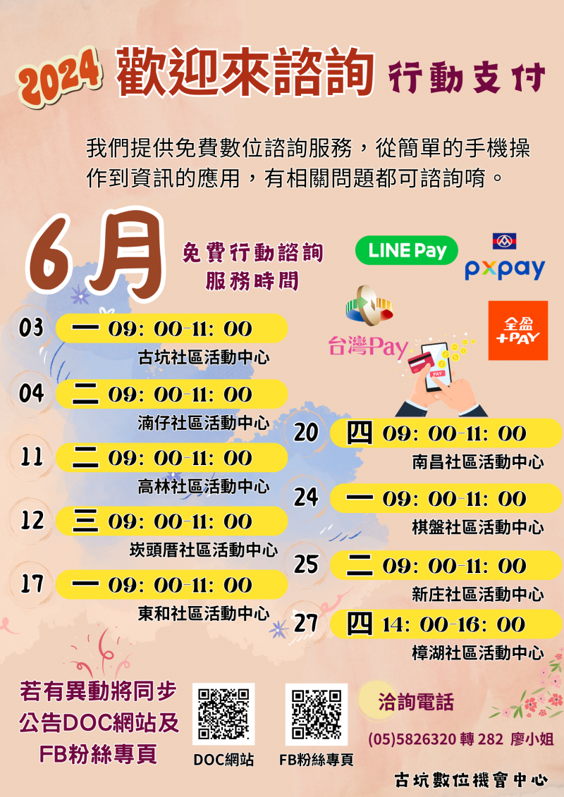 歡迎來詢問~行動支付~6月行動諮詢服務表