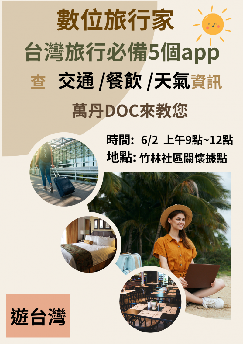 萬丹DOC邀請您參加我們的數位旅行家課程,學習如何使用台灣旅行必備的5個App,讓您的旅行更加便利、精彩!