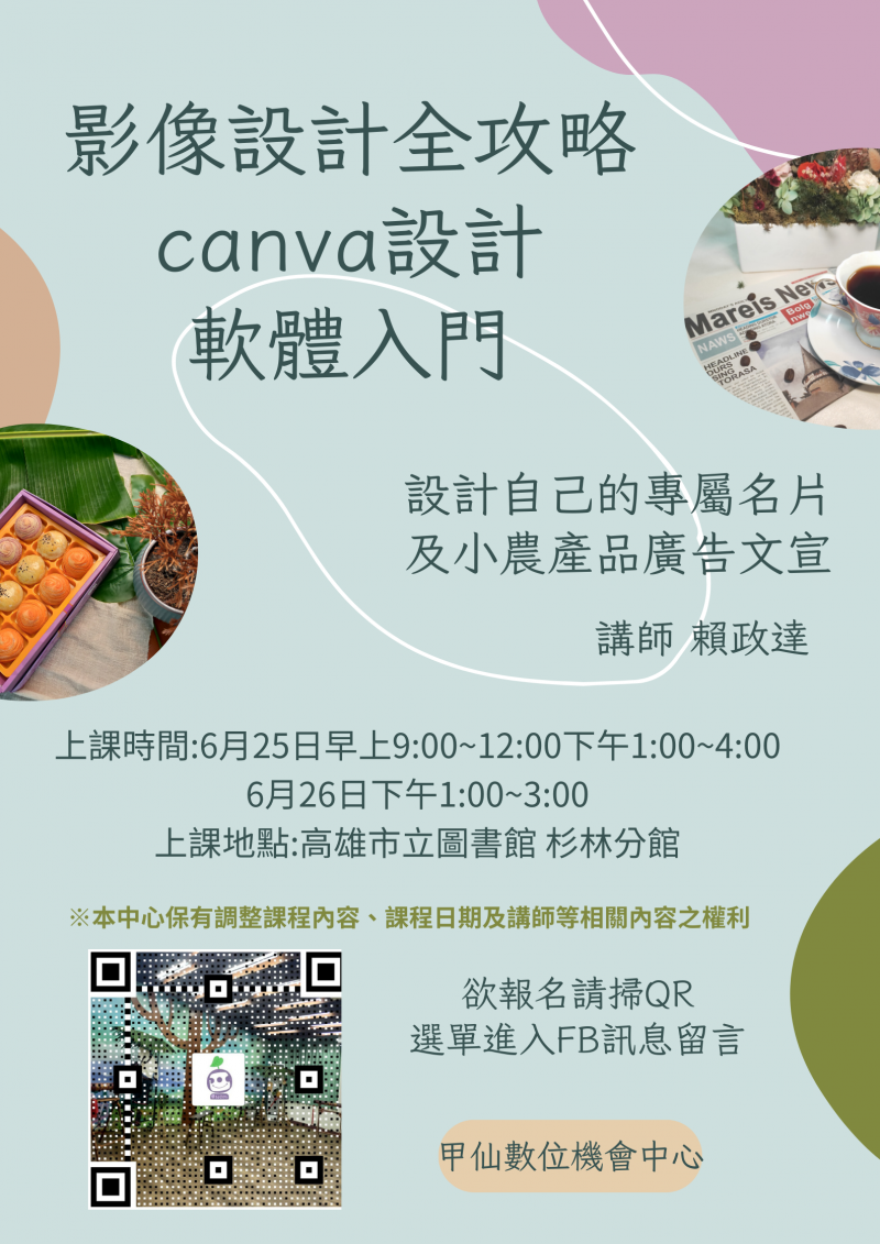 最新消息 DOC快訊 ::: <上一則 返回列表 下一則> 【甲仙DOC】影像設計全攻略~canva設計軟體入門即將開課囉! 發布日期:2024-06-06 人氣:194 開課時間:6月25日早上9:00~12:00下午1:00~4:00 、6月26日下午1:00~3:00 上課地點:高雄市立圖書館杉林分館 <上一則 返回列表 下一則>