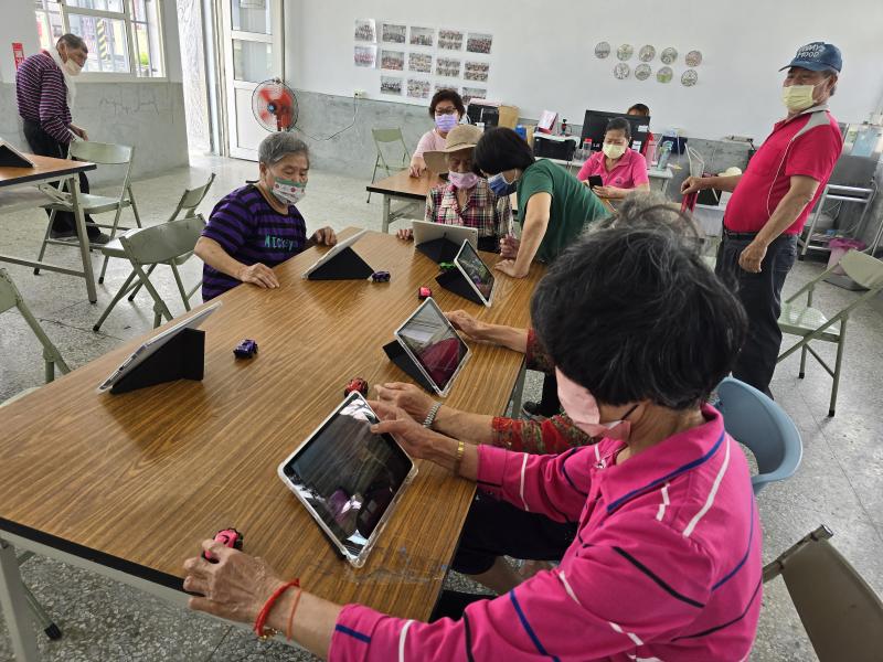 老師教學員逐格動畫的操作,透過相機的拍攝與串聯,讓原本靜態地的圖片能轉換成影片而動了起來,學員移動老師發下的汽車,逐步拍攝透過APP程式地的轉換,原本死板板的圖像竟能動了起來,讓初次學習的長者無不感到好奇與新奇,反覆練習後長者也利用不同道具拍攝出各式新奇好玩的畫面。