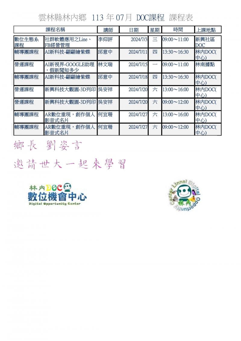 最新消息 DOC快訊 ::: <上一則 返回列表 下一則> 林內DOC 7月份課程表及行動諮詢服務 7月服務時間表 發布日期:2024-06-27 人氣:153 7月份最後一堂數位生態系的課程即將結束在「社群軟體應用之Line、FB經營管理」 有兩堂新的AI課程加入 「AI新科技-翩翩繪紫蝶」、「AI新視界-GOOGLE助理,假新聞知多少」 及1堂「AR數位重現,創作個人影音式名片」 引頸期盼 另外去年受歡迎的「新興科技大觀園-3D列印」 也在今年購買了全新的3D列印機後 令人期待林內DOC 07月份行動諮詢服務時間表 <上一則 返回列表 下一則>