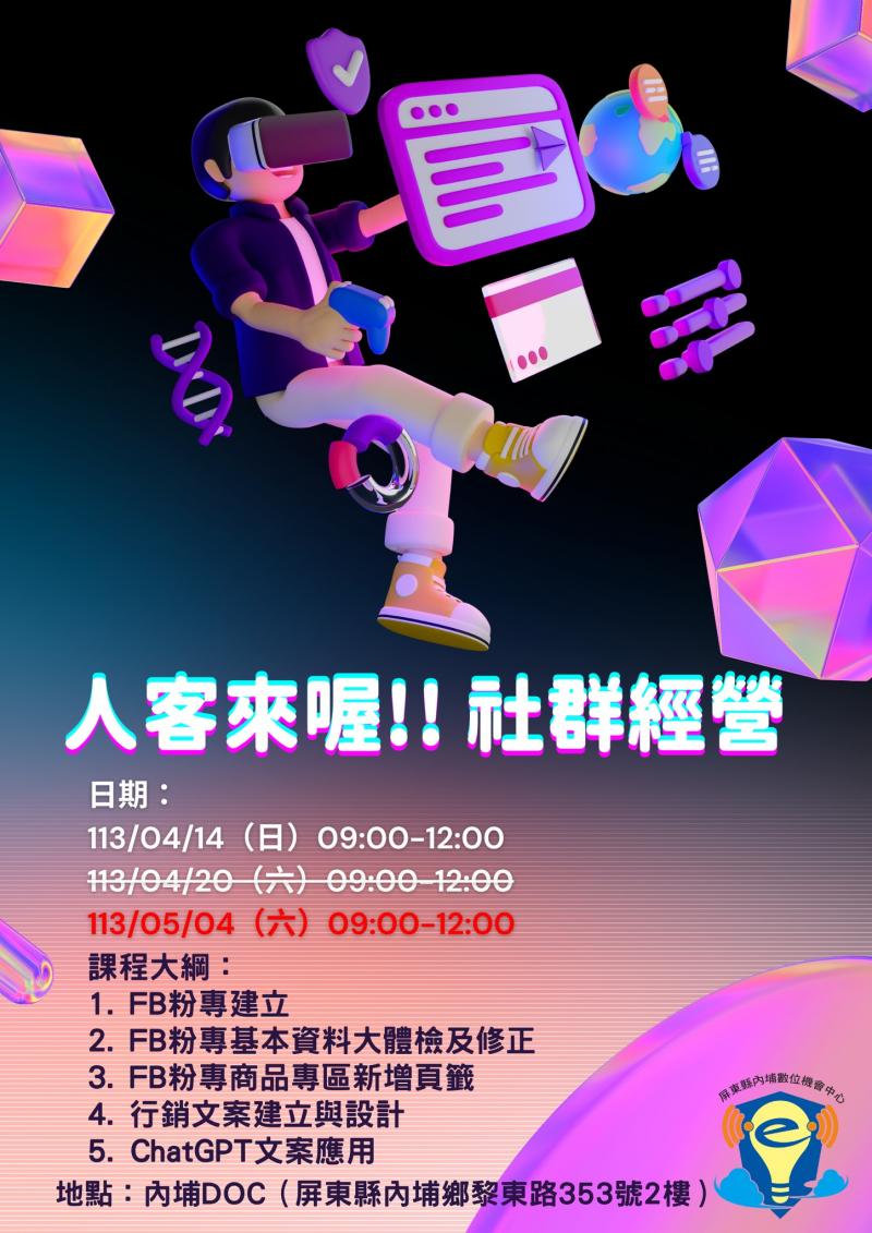 最新消息 DOC快訊 ::: <上一則 返回列表 下一則> 【重要公告】 發布日期:2024-04-19 人氣:115 重要公告!!! 原定113/04/20(六)09:00-12:00的「人客來喔!! 社群經營 」課程 因故改期至113/05/04(六)09:00-12:00進行授課,造成不便,敬請見諒!!! 若是想學習使用AI或是粉專發文一樣可以報名喔~ 報名連結:https://forms.gle/14NAdFb9m4WkwkUk7 明日8:30-16:30依舊有開館,若是有需要數位諮詢或是課程複習的學員還是可以來中心找小編~ <上一則 返回列表 下一則>