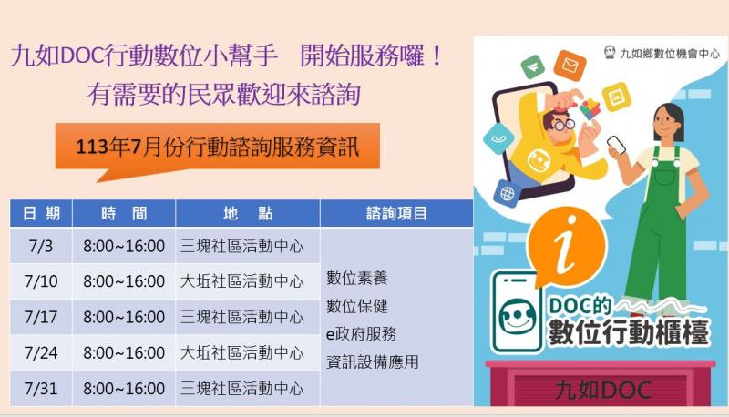 最新消息 DOC快訊 ::: <上一則 返回列表 下一則> 九如DOC 113年7月份行動諮詢服務資訊 發布日期:2024-07-01 人氣:94 九如DOC行動數位小幫手 開始服務囉! 有需要的民眾歡迎來諮詢~~ 113年7月份行動諮詢服務資訊 7/3 8:00~16:00 三塊社區活動中心 7/10 8:00~16:00 大坵社區活動中心 7/17 8:00~16:00 三塊社區活動中心 7/24 8:00~16:00 大坵社區活動中心 7/31 8:00~16:00 大坵社區活動中心 服務項目:數位素養、數位保健,e政府服務、資訊設備應用 <上一則 返回列表 下一則>