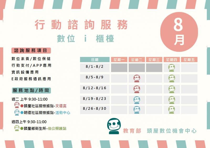 8月頭屋DOC行動諮詢服務如上圖,有時因臨時需要支援社區活動無法到場,請多包涵。