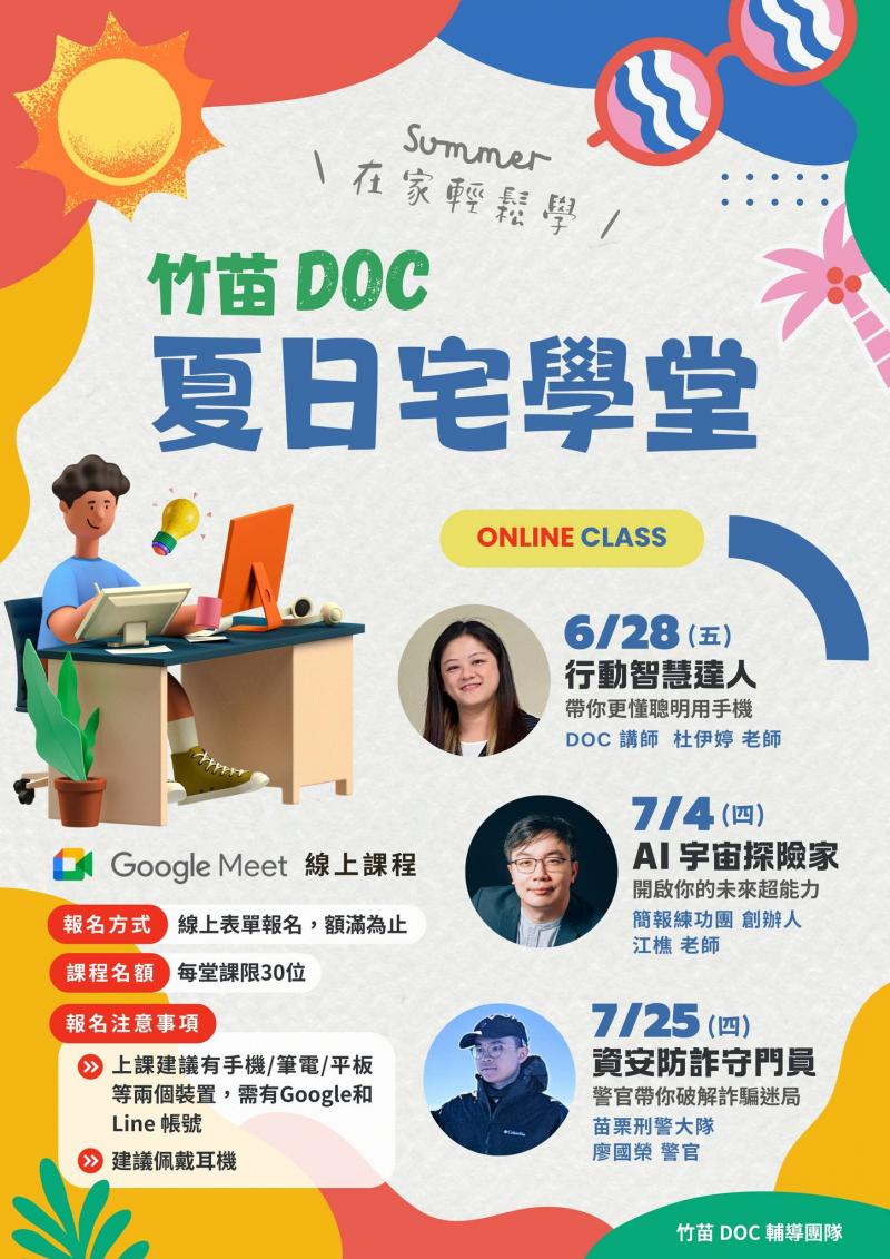 「竹苗 DOC 夏日宅學堂」讓你在家也能精彩學習,無論是想學習新知識,還是提升數位技能,在家視訊連線,享受舒適安心的學習環境,讓炎熱的夏日依然保持學習的熱情。