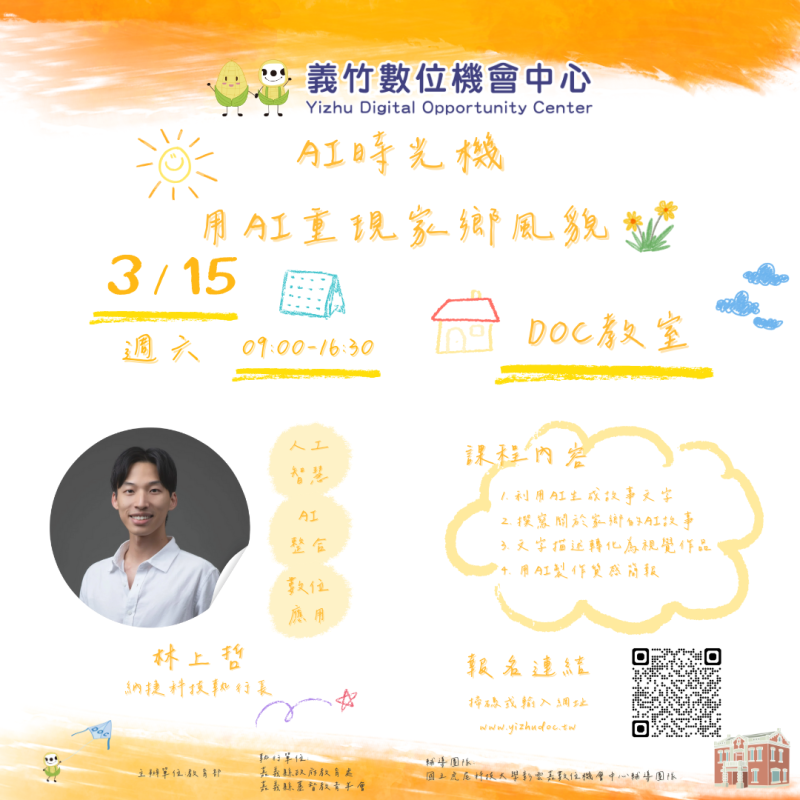 最新消息 DOC快訊 ::: <上一則 返回列表 下一則> 新媒體藝術創客工坊-AI時光機~用AI重現家鄉風貌(3/15週六早上9點~下午4點半) 發布日期:2025-01-03 人氣:136 新媒體藝術創客工坊-AI時光機~用AI重現家鄉風貌(3/15週六早上9點~下午4點半) 報名網址 https://yizhudoc.cyc.edu.tw/modules/tadnews/index.php?nsn=101 <上一則 返回列表 下一則>