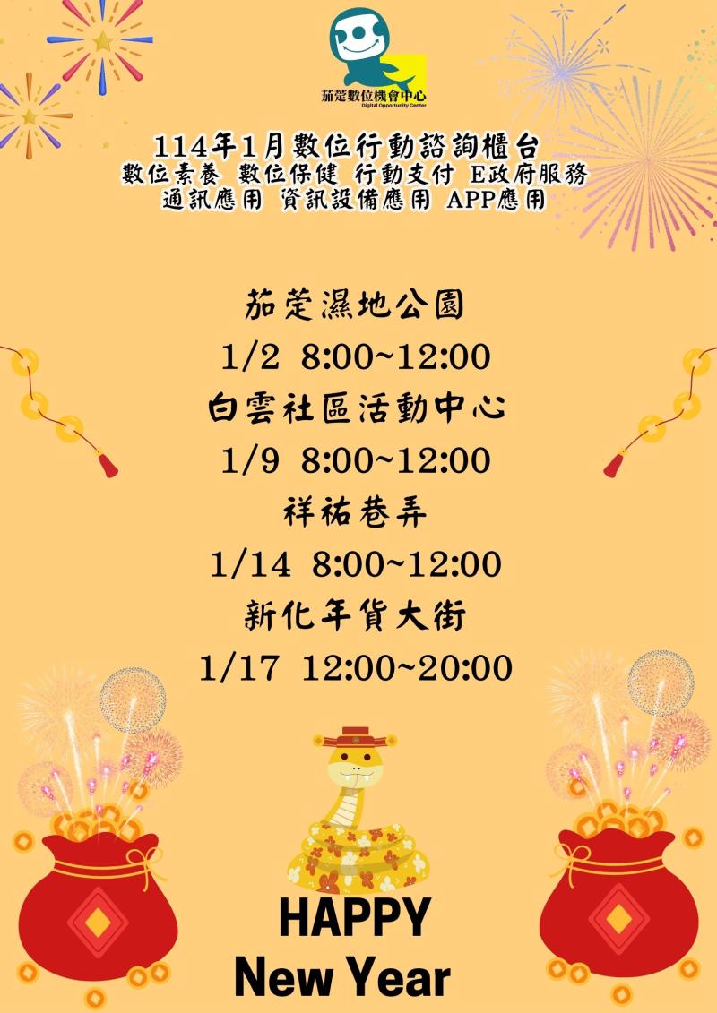 最新消息 DOC快訊 ::: <上一則 返回列表 下一則> 茄萣DOC 114年1月份數位行動諮詢服務 發布日期:2025-01-06 人氣:127 茄萣DOC 114年1月份數位行動諮詢服務 <上一則 返回列表 下一則>