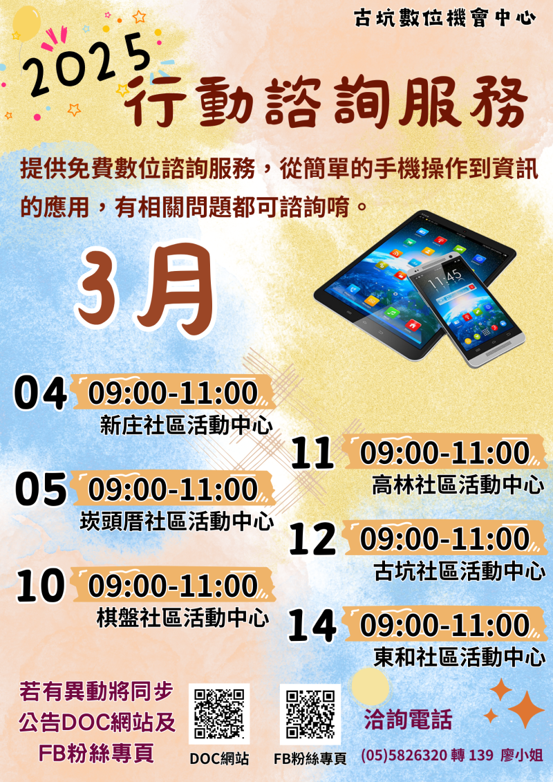 免費行動數位諮詢服務,從簡單的手機操作到資訊的應用及行動支付,有相關問題都可來諮詢唷!