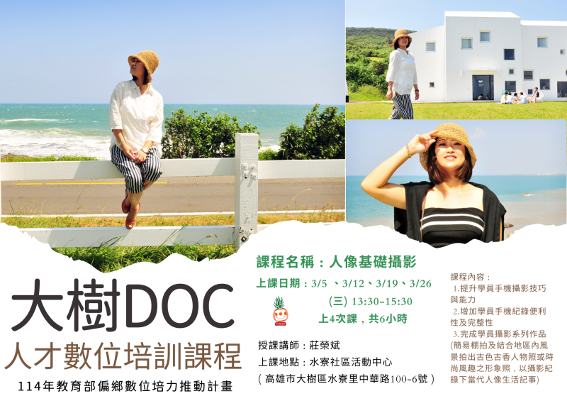 最新消息 DOC快訊 ::: <上一則 返回列表 下一則> 114年大樹DOC 人才數位培訓課程 - 人像基礎攝影 錄取名單 發布日期:2025-03-01 人氣:125 114年大樹DOC 人才數位培訓課程 - 人像基礎攝影 錄取名單 楊O琇、陳O君、林O珍、吳O君、曾O玲、史O春、 林O芬、黃O真、陳O蓮、李O霞、林O如、李O惠、 張O玫、巫O芬、汪O燕、蔡O樹、林O玲、謝O堂、 曾O珠、林O伶、張O英、劉O娟、劉O嬌、林O枝、 林O璸 課程名稱 : 人像基礎攝影 上課日期 : 3/5 、3/12、3/19、3/26 (三) 13:30-15:30 授課講師 : 莊榮斌 上課地點 : 水寮社區活動中心 ( 高雄市大樹區水寮里中華路100-6號 ) <上一則 返回列表 下一則>