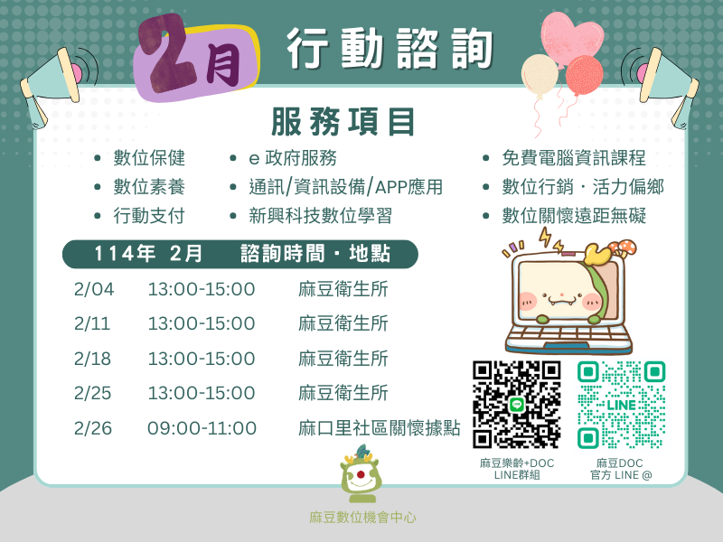 最新消息 DOC快訊 ::: <上一則 返回列表 下一則> 114年 2月行動諮詢時間 發布日期:2025-02-03 人氣:78 🧨過年結束啦~我們又回來啦~ 麻豆DOC行動諮詢日期也來啦 ! 😍 有數位相關問題,歡迎來找我們呦🥰 <上一則 返回列表 下一則>