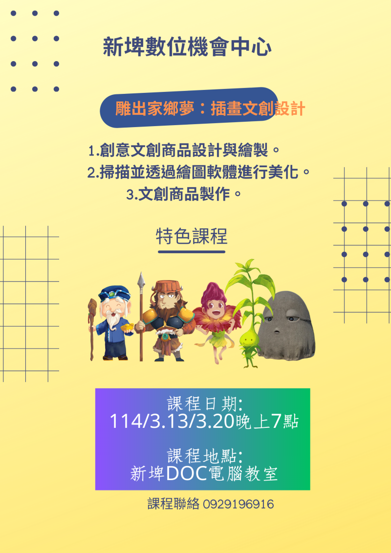 最新消息 DOC快訊 ::: <上一則 返回列表 下一則> 特色課程-雕出家鄉夢:插畫文創設計 發布日期:2025-03-04 人氣:112 特色課程-雕出家鄉夢:插畫文創設計 1.創意文創商品設計與繪製。 2.掃描並透過繪圖軟體進行美化。 3.文創商品製作。 幫助學員將家鄉文化轉化為獨特的文創作品,透過實作,學員能為地方特色品牌創造附加價值,同時培養對科技應用的自信與實踐能力。 <上一則 返回列表 下一則>