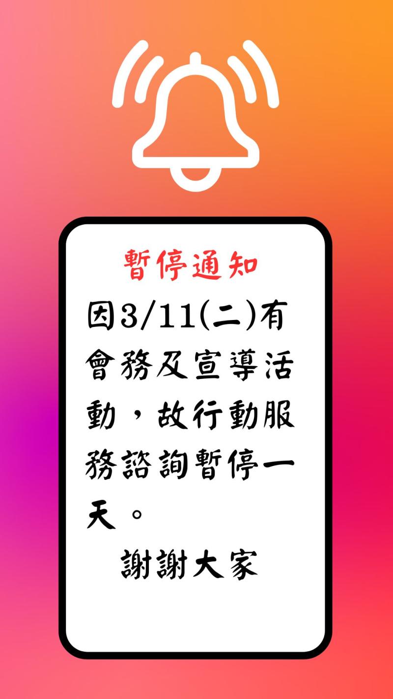 因為3/11(二)當天上午要會務、下午則是要宣導"網路購購物防詐騙",故暫停一天的行動諮詢服務。抱歉