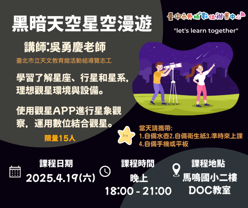 臺中市外埔數位機會中心~4/19(六)黑暗天空星空漫遊~課程招生中~歡迎踴躍報名