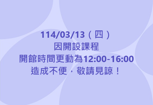 最新消息 DOC快訊 ::: <上一則 返回列表 下一則> 【開館時間更動公告】 發布日期:2025-03-11 人氣:68 114/03/13(四) 因開設課程 開館時間更動為12:00-16:00 造成不便,敬請見諒! <上一則 返回列表 下一則>