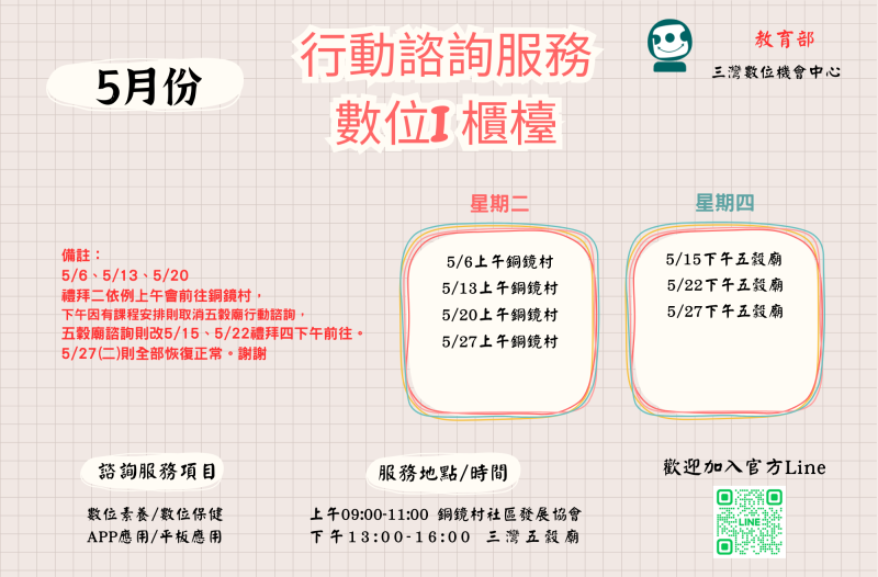 最新消息 DOC快訊 ::: <上一則 返回列表 下一則> 五月份行動諮詢時間表 發布日期:2025-04-29 人氣:52 因5月份前三週的禮拜二下午皆有課程安排,所以下午五穀宮行動諮詢取消,下午五穀宮行動諮詢改為5/15(四)、5/22(四)下午,而銅鏡村上午則是照常前往。 5/27(二)一樣恢復原有安排。上下午都會行動諮詢 <上一則 返回列表 下一則>