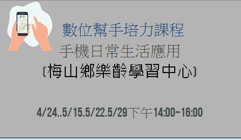 數位幫手培力課程 培訓社區工作者、志工及在地學員能在數位素養、與手機影音剪輯,善用手機上的各種應用成為數位好幫手,可教導或協助民眾數位生活應用。 時間:4/25.5/15.5/22.5/29下午14:00~16:00 地點:嘉義縣梅山鄉樂齡學習中心