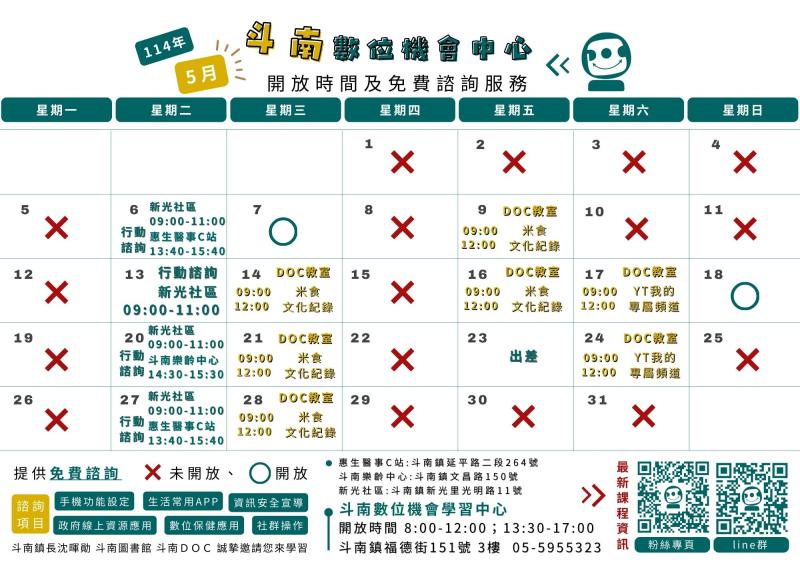 📢 5 月斗南DOC行動諮詢&開放時間來囉! 👋 斗南鄉親注意~ 手機不會用?想學更聰明用3C? 斗南DOC出動啦,進社區 #免費 幫你解決數位大小事! 🔧【行動諮詢是什麼?】 我們是你的數位小幫手, 從手機設定到APP教學,輕鬆幫你搞懂! 📍 斗南DOC平時在圖書館三樓,歡迎上來找我們諮詢喔! 📱【服務內容】 手機設定|常用APP|資訊安全|政府資源|數位健康|社群操作 📅 詳細開放時間請看圖片,別錯過囉~
