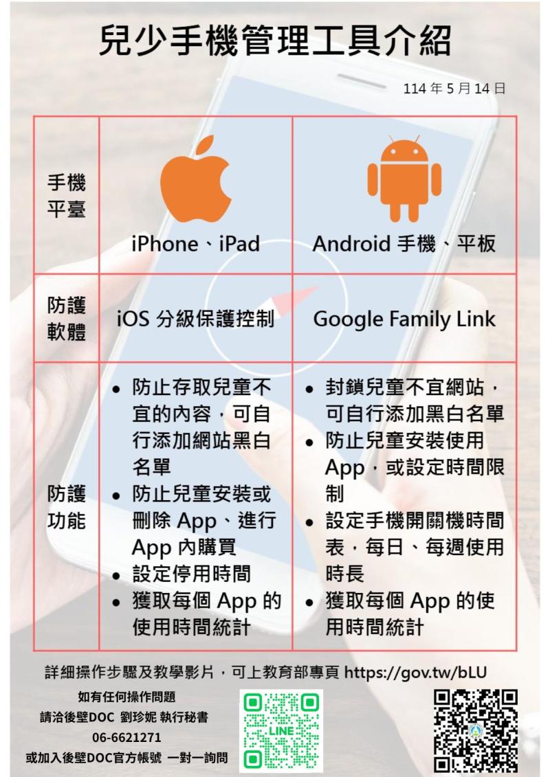 最新消息 DOC快訊 ::: <上一則 返回列表 下一則> 「教育部TANet青少年網路內容防護計畫」-DOC協力家長防治兒少不當使用通訊產品! 發布日期:2025-05-29 人氣:190 因應網路普及和線上影音媒體的快速發展,為了避免兒童與青少年在網路上觀看、閱覽、收聽或使用有害其身心健康的資訊內容,DOC協力家長防治兒少不當使用通訊產品,有興趣的家長可觀看以下操作手冊與影片,讓你輕鬆打造兒少安全的上網環境給孩子數位自由,給彼此更多信任,和孩子這樣開始討論手機規則吧! <上一則 返回列表 下一則>