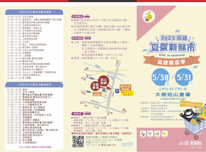 最新消息 DOC快訊 ::: <上一則 返回列表 下一則> 2025高雄鳳荔季-高雄大樹一年一度的鳳荔季 發布日期:2025-05-30 人氣:113 高雄大樹一年一度的鳳荔季即將熱鬧登場啦~歡迎一起來大樹享受夏日鳳荔的魅力吧! 活動日期:5/30(五)–5/31(六)10:00-17:00 活動地點:大樹姑山倉庫(高雄市大樹區大坑路108-18號)樂活DIY文創商品 精美宣導品 <上一則 返回列表 下一則>