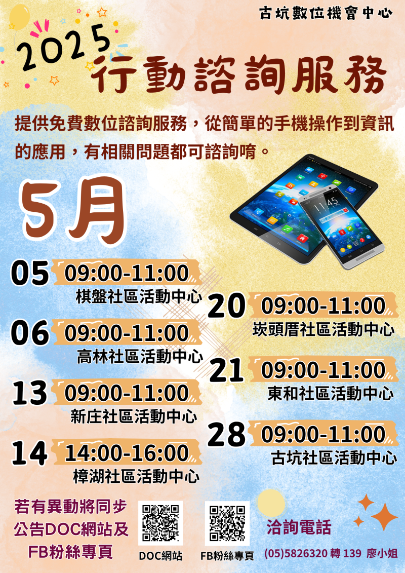 最新消息 DOC快訊 ::: <上一則 返回列表 下一則> 5月行動諮詢服務 發布日期:2025-04-30 人氣:82 5月行動諮詢服務表 免費行動數位諮詢服務,從簡單的手機操作到資訊的應用及行動支付,有相關問題都可來諮詢唷! 諮詢服務項目: 3C設備應用(手機、平板功能設定) 資訊應用(搜尋引擎、G-mail、地圖) 生活應用(LINE、臉書) 行動支付(Pxpay、LINE Pay...) 備註:若有異動將同步公告DOC網站及粉絲專頁 古坑DOC FB粉絲頁: https://www.facebook.com/gukengdoc <上一則 返回列表 下一則>