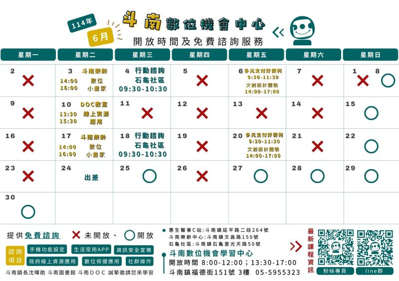 🎉【6月】斗南 DOC 數位出任務 🚀 🧓👵 阿公阿嬤、爸爸媽媽、社區好鄰居們~ 手機不靈光、APP怎麼用都搞不懂? 別煩惱,斗南 DOC開放諮詢服務 💡不分年齡、不用報名,走過路過都能問, 讓科技變簡單,生活更 Easy! 📍 斗南 DOC 據點:圖書館三樓 📅 開放時間及前往社區時間 請看圖片!絕對要筆記起來! 📱【我們能幫你這些】 ✔ 手機基本操作 ✔ 熱門 APP 用法 ✔ 資安新觀念 ✔ 社群平台操作等等