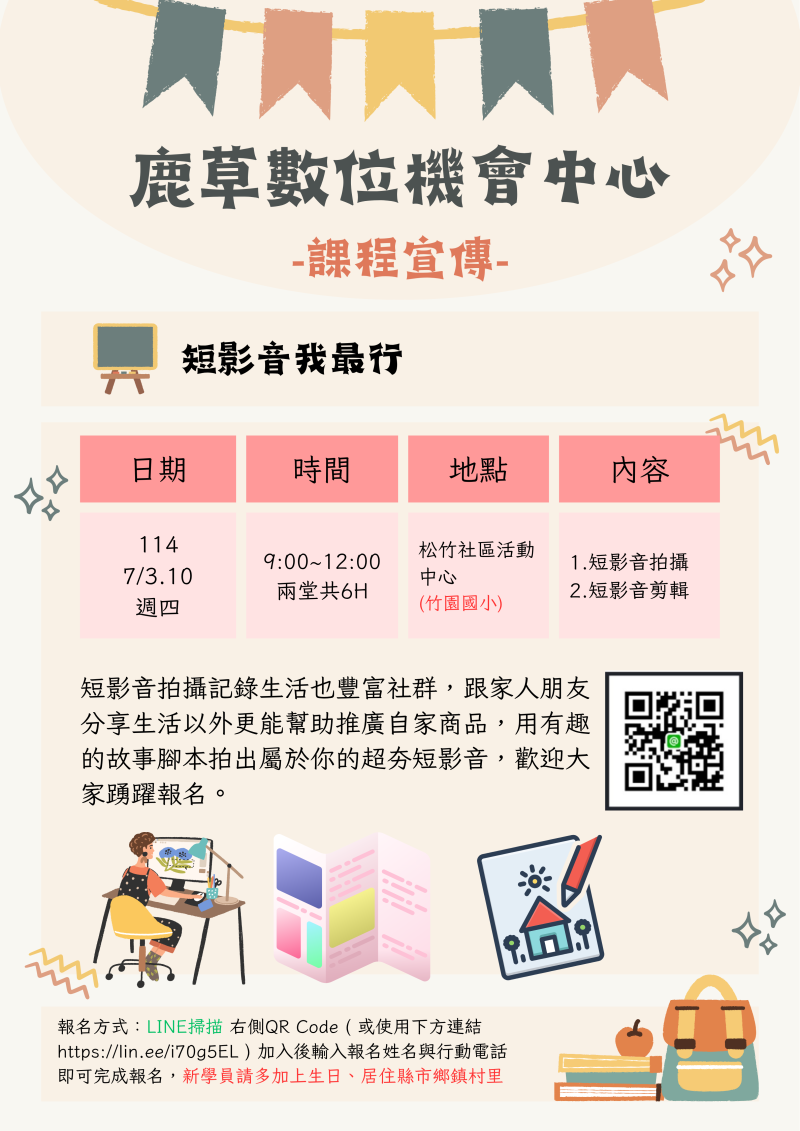 短影音拍攝記錄生活也豐富社群,跟家人朋友分享生活以外更能幫助推廣自家商品,用有趣的故事腳本拍出屬於你的超夯短影音,歡迎大家踴躍報名。