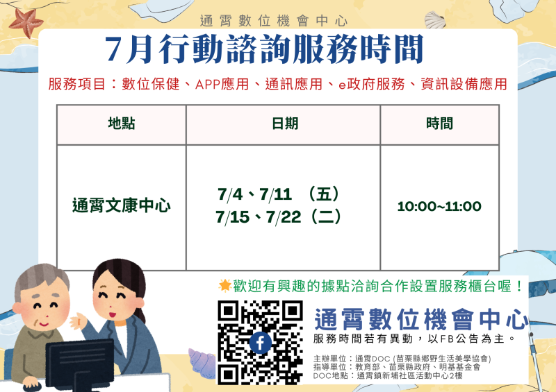 親愛的學員們好,我們每月設置「行動諮詢服務」櫃檯,為偏鄉民眾解決各類數位問題,包含手機設定、社群媒體操作及數位工具使用等,提供一對一協助。