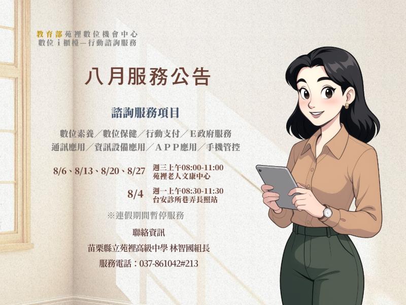 各位朋友大家好: 為了讓更多民眾方便處理數位問題,我們提供「數位i櫃檯—行動諮詢服務」,如果您有手機設定、應用程式或是數位工具操作等疑問,可以攜帶您的手機或平板設備來現場,我們會在現場協助您,期待您的參與。 八月服務時間: 8/4 週一上午08:30-11:30 台安診所巷弄長照站 8/6、8/13、8/20、8/27 週三上午08:00-11:00 苑裡老人文康中心