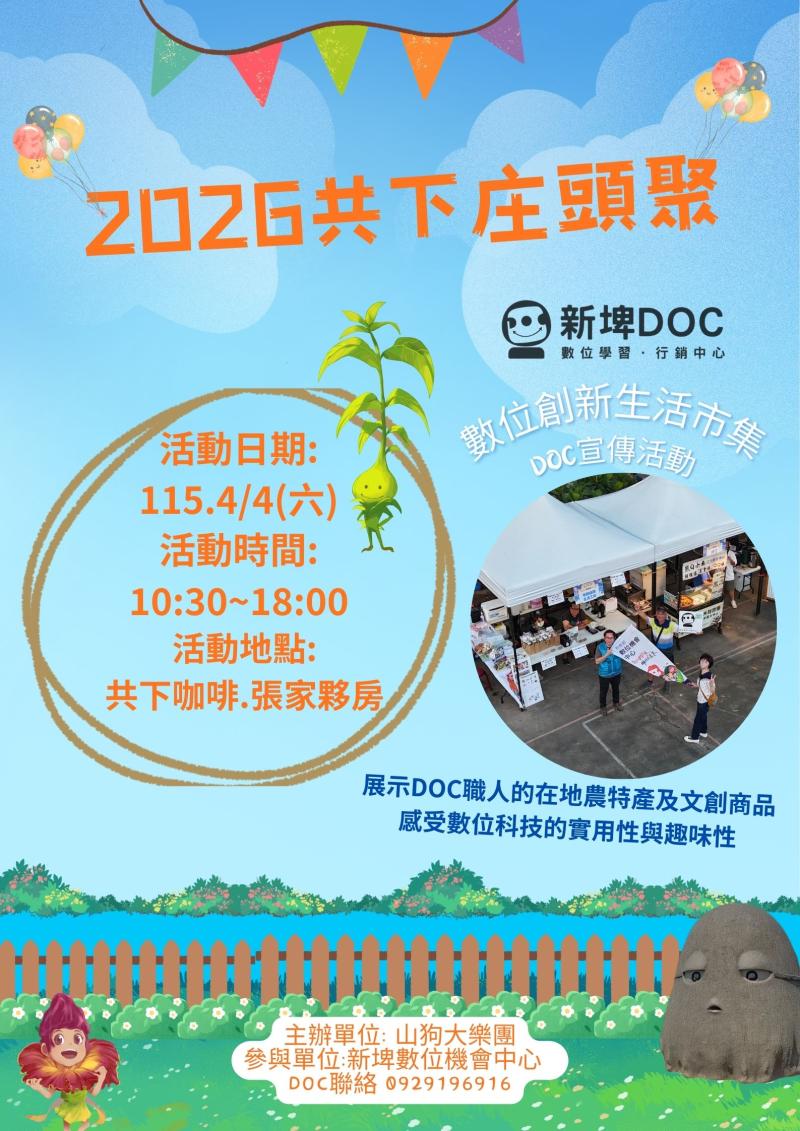 最新消息 DOC快訊 ::: <上一則 返回列表 下一則> 【數位創新生活市集】DOC宣傳活動 發布日期:2026-03-13 人氣:10 【數位創新生活市集】DOC宣傳活動 活動結合社區節慶市集舉辦「數位創意生活市集」,透過設置數位展示區與行動諮詢服務攤位,推廣DOC課程與數位應用。現場提供平板示範教學、數位行銷與線上購物體驗,讓民眾了解如何運用數位工具推廣產品與便利生活。 活動日期 : 115.4/4(六) 10:30~18:00 活動地點 : 新埤社區 (張家夥房.共下咖啡) 2026共下庄頭聚 <上一則 返回列表 下一則>