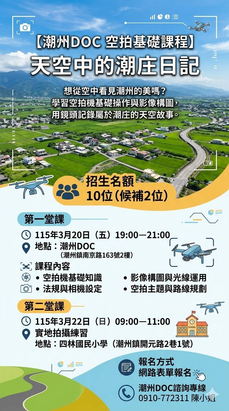最新消息 DOC快訊 ::: <上一則 返回列表 下一則> 115.3.20-3.22天空中的潮庄日記 發布日期:2026-03-13 人氣:7 📸【潮州DOC空拍課程】天空中的潮庄日記 ✈️ 想學空拍機嗎? 從零開始學拍攝天空中的潮州! 👥名額:10位(候補2位) 📅3/20(五)19:00–21:00 空拍機法規+ 空拍主題與路線規劃 📍 地點: 潮州DOC(南京路163號2樓) 📅3/22(日)09:00–11:00 戶外實拍練習( 空拍機設定+ 基礎操作與影像拍攝 ) 📍 地點:四林國民小學 (潮州鎮開元路2巷1號) ☎諮詢:0910-772311 陳小姐 <上一則 返回列表 下一則>