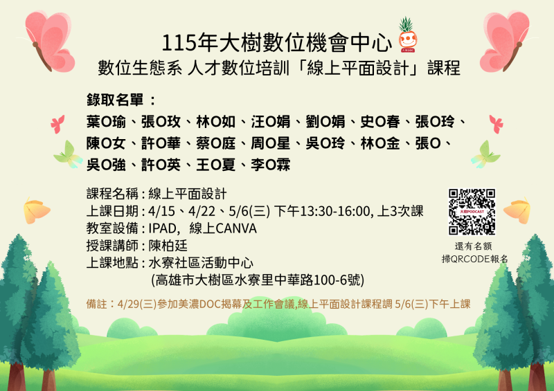 115年大樹DOC 數位生態系-人才數位培訓「線上平面設計」課程,還有2個名額 歡迎報名上課~