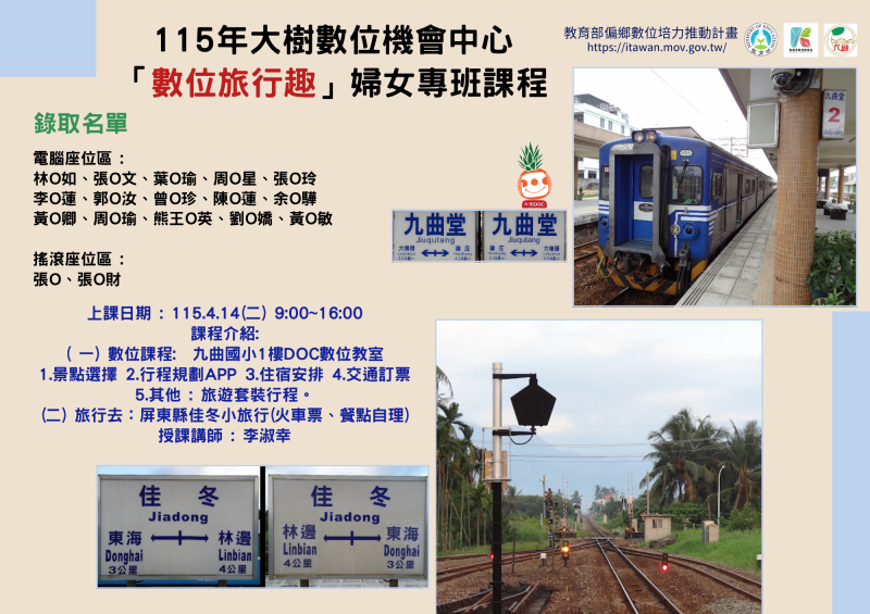 115年大樹數位機會中心「數位旅行趣」婦女專班課程