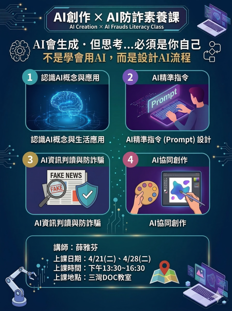 最新消息 DOC快訊 ::: <上一則 返回列表 下一則> 招生通知-跟著AI創作 × AI判讀 發布日期:2026-04-13 人氣:24 【課程預告】 這門課將帶大家認識AI的基本概念,學習如何設計Prompt與AI互動生成文字與圖像,同時加入AI資訊判讀與防詐騙內容,透過課堂學習辨識假圖片、假訊息與常見網路詐騙。最後會整合文字、圖像與音樂工具,完成一個AI創作作品。 開放報名時間:4/15(三)10:00 說明:正取20名確認公告後, 會在開放旁聽10名左右。 因為是系列課程,建議能全程參與再報名喔!如果無法全程參與者,建議報名旁聽。謝謝~ <上一則 返回列表 下一則>