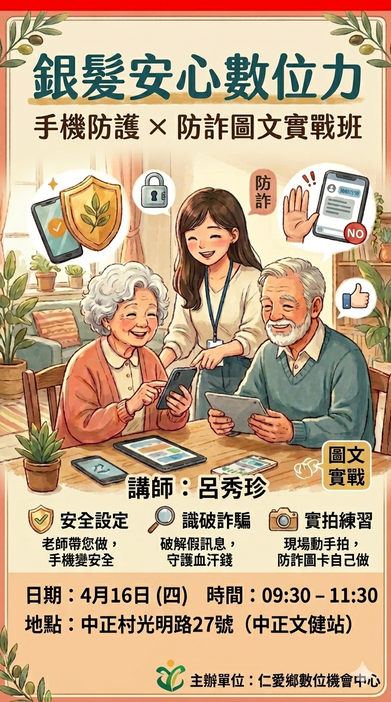 最新消息 DOC快訊 ::: <上一則 返回列表 下一則> 銀髮安心數位力:手機防護 × 防詐宣導圖文實戰班 發布日期:2026-04-15 人氣:23 📅 日期: 4月16日 (星期四) ⏰ 時間: 09:00 – 13:00 📍 地點: 中正村光明路27號(中正文健站) 👩🏫 講師: 呂秀珍 電話:0909-596345 報名網址:https://forms.gle/9Em7Dt9fCJunK99y9 🛠️ 課程內容三大重點 ✅ 安全設定: 老師帶您做,手機變安全。 🔎 識破詐騙: 破解假訊息,守護血汗錢。 📸 實拍練習: 現場助手拍,防詐圖卡自己做。 <上一則 返回列表 下一則>