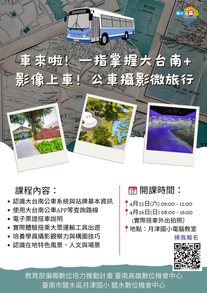 最新消息 DOC快訊 ::: <上一則 返回列表 下一則> 【鹽水DOC_課程通知】車來啦!一指掌握大台南+ 影像上車!公車攝影微旅行 發布日期:2026-04-19 人氣:29 <上一則 返回列表 下一則>