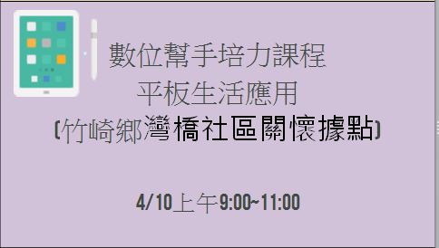 最新消息 DOC快訊 ::: <上一則 返回列表 下一則> 平板生活應用 發布日期:2026-04-22 人氣:20 數位幫手培力課程 平板生活應用 學員學會手機/平板功能操作應用,並能建立基礎資安觀念。 上課 時間:4/10 上午 9:00~11:00 上課 地點:嘉義縣竹崎鄉灣橋社區關懷據點 <上一則 返回列表 下一則>