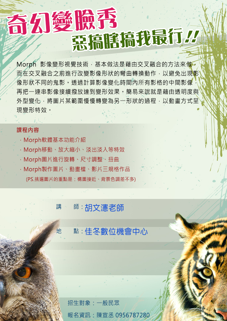 最新消息 DOC快訊 ::: <上一則 返回列表 下一則> 奇幻變臉秀!惡搞瞎搞一起來! 發布日期:2017-09-01 人氣:188 佳冬數位中心要來教大家用電腦做影像處理以及製作動畫特效! 特聘非常棒的講師遠赴佳冬來教學,名額有限,歡迎大家來報名! 一、本課程僅招收九位學員,身分年齡不拘。(但至少熟悉基本電腦操作) 二、報名日期即日起至09/09(星期日),額滿6位即可開班,額滿為止。 三、上課時間:屆時通知,以週休二日上午時段為主。 四、上課地點:佳冬鄉數位學習中心(屏東縣佳冬鄉石光村民有街21號) 五、報名專線:0956787280 陳主任 <上一則 返回列表 下一則>