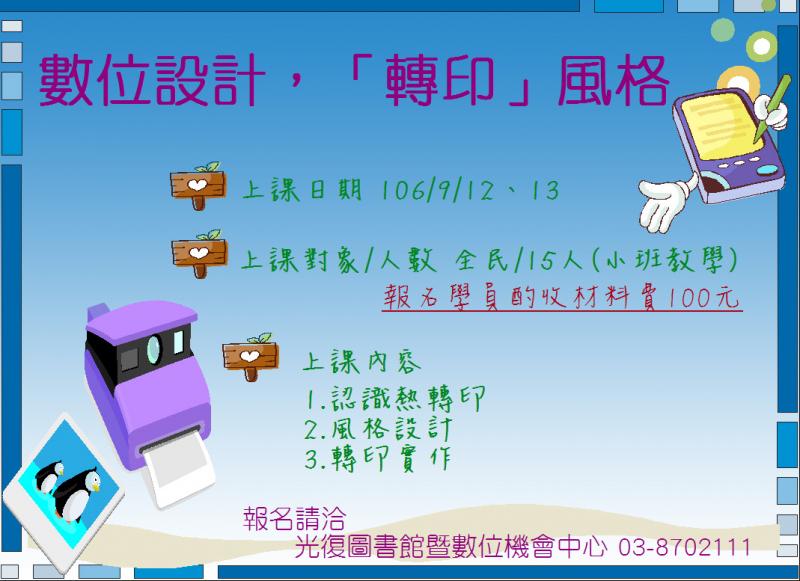 最新消息 DOC快訊 ::: <上一則 返回列表 下一則> 光復圖書館暨數位機會中心【社區課資訊公告】 發布日期:2017-09-06 人氣:236 親愛的鄉親及學員 下周社區課【數位設計,轉印風格】即將開課囉! 課程資訊如下 上課時間:9/12、13 晚間7:00-9:00 上課地點:光復圖書館2樓 上課名額:15名(名額有限,報名要快喔) 小叮嚀 此課程需購買材料製作,將酌收100元材料費,上課當日繳納即可。 如需詢問詳情及報名請洽03-8702111 或至光復圖書館暨數位機會中心櫃檯洽詢 <上一則 返回列表 下一則>