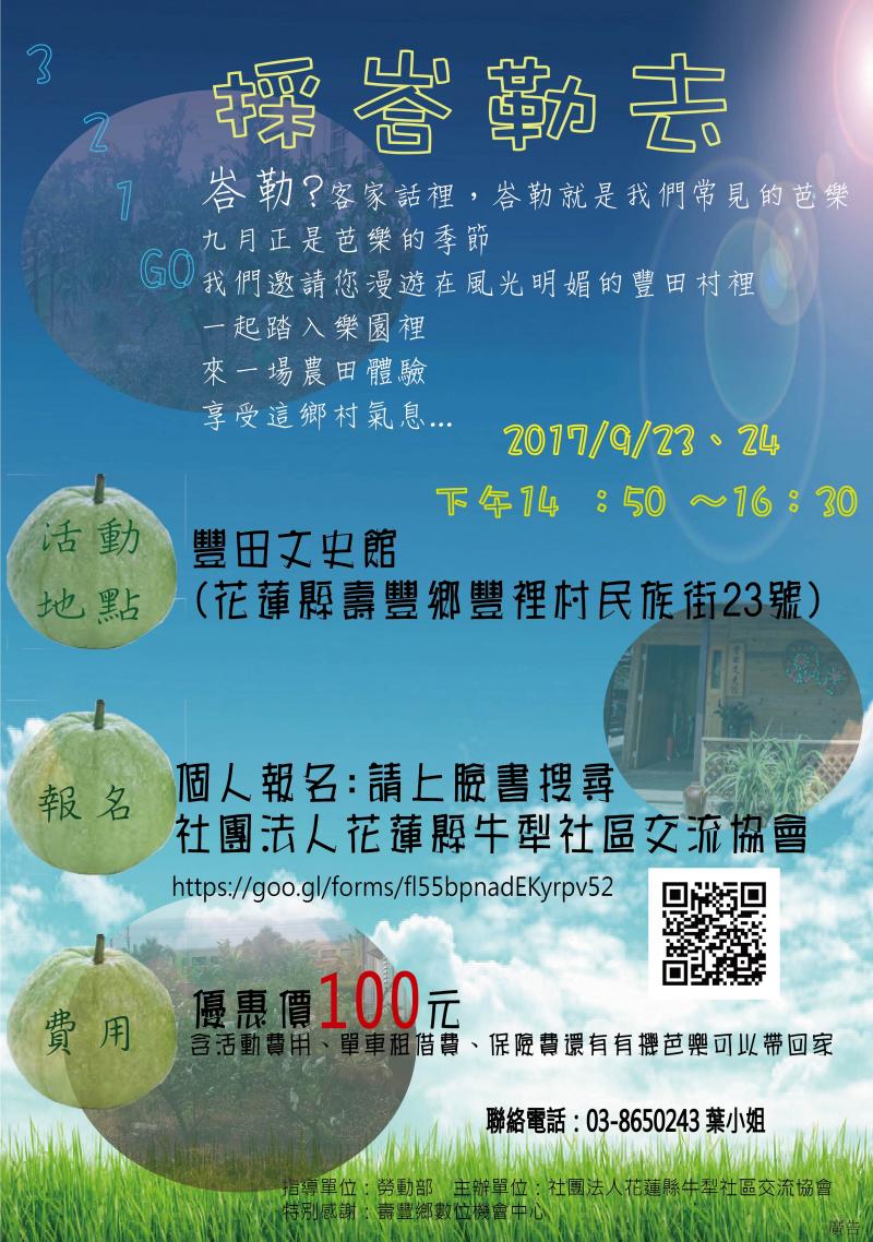 最新消息 DOC快訊 ::: <上一則 返回列表 下一則> 9月豐田文史館321GO活動來啦 發布日期:2017-09-14 人氣:329 農田體驗--採峇勒去 九月正是芭樂盛產的季節 邀請大家來我們豐田 享受鄉村的氣息 體驗農田的小趣事 優惠報名價只要100元喔 包含單車租借、保險及活動費用 還有有機芭樂可以帶回家喔!! 是不是非常划算啊!! 快來報名吧各位 9月24日已報名額度達上限!! 只剩9月23日名額了啊!要搶要快 https://goo.gl/forms/Wzx7ufU4bWwKJ26L2 <上一則 返回列表 下一則>