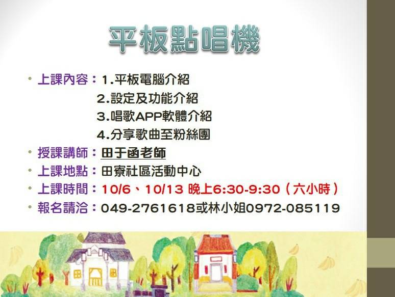 最新消息 DOC快訊 ::: <上一則 返回列表 下一則> 平板點唱機 發布日期:2017-09-24 人氣:302 教學內容1.平板電腦介紹2.設定及功能介紹3.唱歌APP軟體介紹4.分享歌曲至粉絲團,除此之外田老師也會在課堂上,增加更多引起學員學習興趣之課程,如拍照技巧或美編照片,增加大家生活精采回憶,讓學員更有學習動力。 <上一則 返回列表 下一則>