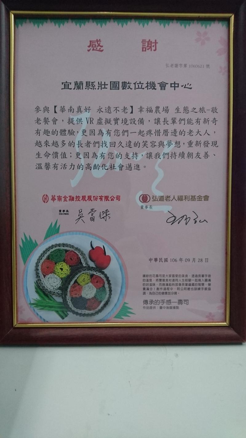 最新消息 DOC快訊 ::: <上一則 返回列表 下一則> 參與[華南真好 永遠不老]幸福農場 生態之旅-敬老餐會 發布日期:2017-09-29 人氣:358 #收到感謝狀 #感謝宜蘭縣壯圍數位機會中心 參與[華南真好 永遠不老]幸福農場 生態之旅-敬老餐會,提供VR 虛擬實境設備,讓長輩們能有新奇有趣的體驗,更因為有您們一起疼惜厝邊的老大人,越來越多的長者們找回久違的笑容與夢想,重新發現生命價值;更因為有您的支持,讓我們持續朝友善、溫馨有活力的高齡化社會邁進。 #感謝華南金控股份有限公司 #感謝弘道老人福利基金會 #宜蘭長輩福氣啦 <上一則 返回列表 下一則>