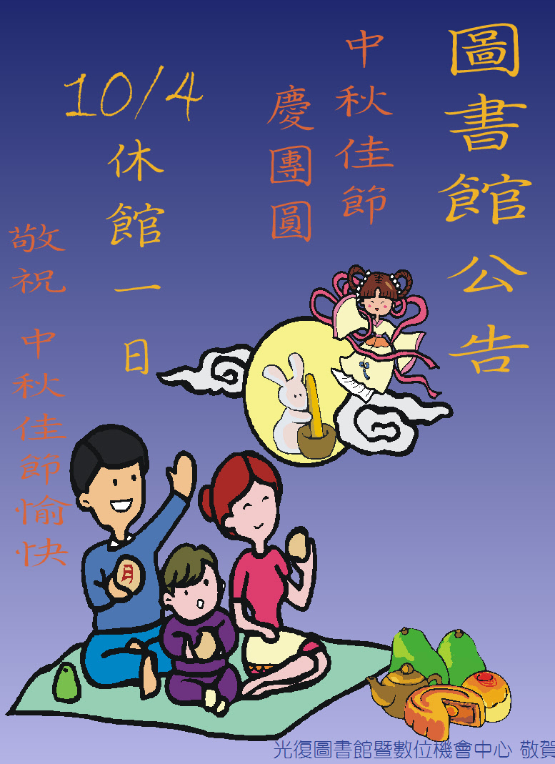 最新消息 DOC快訊 ::: <上一則 返回列表 下一則> 光復圖書館暨數位機會中心【休館公告】 發布日期:2017-10-03 人氣:404 歡慶中秋,休館一日雙十國慶連假,休館四日,造成不便 敬請見諒。 <上一則 返回列表 下一則>