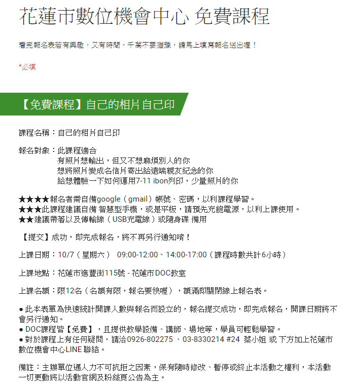 ● 此本表單為快速統計開課人數與報名而設立的,報名提交成功,即完成報名,開課日期將不會另行通知。