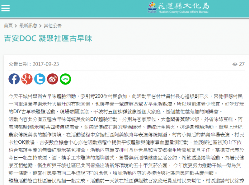 最新消息 DOC快訊 ::: <上一則 返回列表 下一則> 花蓮縣文化局09/23報導 發布日期:2017-10-14 人氣:174 http://www.hccc.gov.tw/zh-tw/News/Detail/7145 <上一則 返回列表 下一則>
